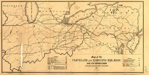Jacob Perkins, a prominent attorney in the city of Warren in Trumbull County, Ohio,[1] was the leader in the movement to build a railroad between Cleveland (a fast-growing industrial center and port on the shores of Lake Erie) and the coal fields of east-central Ohio.[2] A previous road to that area, the Ohio and Erie Railroad, was proposed earlier but nothing came of this project.[3] Perkins helped incorporate the Cleveland and Mahoning Railroad, which was chartered by the state of Ohio on February 22, 1848. It was authorized to build a rail line from Cleveland to an unspecified point near Warren.[4][5] Initially, Perkins attempted to interest the Ohio and Pennsylvania Railroad (O&P) into building the line, but that company declined. He then offered the charter to the Pittsburgh and Erie Railroad, but it was uninterested as well.[2]