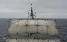 Buntlines lift the middle portion of the sail, or "bunt"; there will usually be four to eight buntlines across the foot of the sail. Traditionally they are secured to the sail with buntline hitches.[1] Since buntlines only have to lift a section of canvas, they can be thinner than the clewlines and are not usually fitted with a purchase. A typical arrangement for the buntlines has them running through deadeyes on the yard, upwards to a block fixed to the shrouds a little higher up the mast, and then downwards against the inside of the ratlines to the deck. This provides a good lead but does create a minor obstacle to sailors moving out along the yards.
