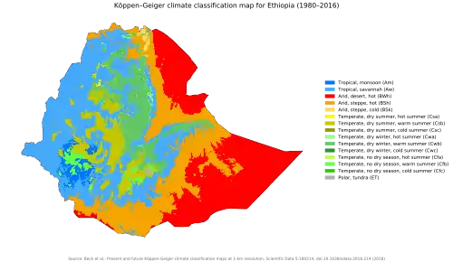 - 1 2 3 4 Simane, B.; Beyene, H.; Deressa, W.; Kumie, A.; Berhane, K.; Samet, J. (23 June 2022). "Review of Climate Change and Health in Ethiopia". The Ethiopian Journal of Health Development = Ya'ityopya Tena Lemat Mashet. 30 (1 Spec Iss): 28–41. PMC 5578710. PMID 28867919.