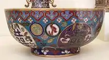 From Byzantium or the Islamic world the technique reached China in the 13–14th centuries; the first written reference is in a book of 1388, where it is called "Dashi ware". No Chinese pieces clearly from the 14th century are known, the earliest datable pieces being from the reign of the Xuande Emperor (1425–35), which however show a full use of Chinese styles suggesting considerable experience in the technique.[28] It was initially regarded with suspicion by Chinese connoisseurs, firstly as being foreign, and secondly as appealing to feminine taste. However, by the beginning of the 18th century the Kangxi Emperor had a cloisonné workshop among the many Imperial factories. The most elaborate and highly valued Chinese pieces are from the early Ming Dynasty, especially the reigns of the Xuande Emperor and Jingtai Emperor (1450–57), although 19th century or modern pieces are far more common. The Chinese industry seems to have benefited from a number of skilled Byzantine refugees fleeing the Fall of Constantinople in 1453, although based on the name alone, it is far more likely China obtained knowledge of the technique from the middle east. In much Chinese cloisonné blue is usually the predominant colour, and the Chinese name for the technique, jingtailan ("Jingtai blue ware"), refers to this, and the Jingtai Emperor. Quality began to decline in the 19th century. Initially heavy bronze or brass bodies were used, and the wires soldered, but later much lighter copper vessels were used, and the wire glued on before firing.[29][30] The enamels compositions and the pigments change with time.