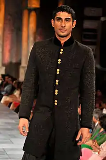 Achkan is a small jacket that usually sports exposed buttons throughout the length of the jacket. The length is usually just at the knees and the jacket ends just below the knee. Achkan is very similar to the Sherwani which is a much longer coat-jacket dress. The jacket has a Nehru collar.[50] The Achkan was mostly worn with tight-fitting pants or trousers called churidars. Achkan is made from various fabrics for both formal and informal occasions. The achkan features traditional Indian embroidery like gota and badla. Achkan was commonly worn by the grooms during wedding ceremonies[51] or other formal festive occasions in the Indian subcontinent but when it evolved into the Nehru Jacket, the achkan became less worn. It was used by men. In India, the achkan is generally worn for formal occasions in winter, especially by those from Rajasthan, Punjab, Uttar Pradesh and Hyderabad. The achkan later evolved into the Nehru Jacket, which is now popular in India. It may be embroidered with gold or silver. A scarf called a dupatta is sometimes added to the achkan.