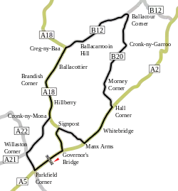 The course is 10.92 mi (17.57 km) long[1] and is in the parish of Onchan in the Isle of Man. The course uses two short sections of the Snaefell Mountain Course which includes the primary A18 road between Cronk-ny-Mona and Creg-ny-Baa used in the reverse direction. Also, the primary A18 Mountain Road between Signpost Corner and Governor's Bridge. The highest point of the course is 856 ft (261 m) above sea level at Ballacarrooin Hill (Ordnance Survey grid reference SC 406 827). The name Clypse is probably a contraction from the Scandinavian word Kleppsstar ( Kleppr's farm) which gives the modern name of Clypse Beg and Clypse Mooar.[2]