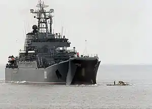 The Coastal Troops (Russian: Береговые войска, romanized: Beregovyye voyska) are a service arm of the Russian Navy. Their missions are to protect Russian fleets' forces, personnel, and seashore objects from enemy surface ships; to defend naval bases and other important facilities of the Fleets from land attacks, including amphibious and air assaults; to participate in amphibious and air assaults; to support the Russian Ground Forces in defending against airborne and amphibious assaults; and to destroy enemy surface ships, boats and amphibious transports in their operational area.[2]