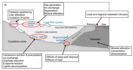 Physical and chemical reactions occur in coastal aquifers, including oxidation-reduction reactions, mineral dissolution and precipitation, acid-base reactions, ion exchange, and gases dissolution and exsolution.[50][51] Those chemical processes also happen in terrestrial aquifer system. The rate of different chemical processes depend on temperature and pressure of different part of the aquifers. Rain is the major recharge for different aquifers. Thus, groundwater would be acidic. Groundwater becomes less acidic with increases flow path or flow distance.[49][2]