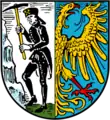 The arms are composed of two symbols. The left (heraldic: dexter) half shows a miner digging with a pickaxe for smithsonite, referring to the town's centuries-long tradition as a mining area. The right (heraldic: sinister) half features a golden demi-eagle on a blue field, (half of) the device of the Upper Silesian dukes of the Piast dynasty. This combination of a miner and the ducal eagle dates from the 14th century.[1]