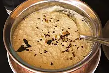 Coconut chutney is a south Indian chutney, a side-dish or a condiment,[1] common in the Indian subcontinent. The condiment is made with coconut pulp ground with other ingredients such as green chillies, tamarind, salt, coriander and water.[1] Coconut chutney is made with both red chillies or green chillies. It is served with dosas, idli, bajji, bonda, and vada.[2] In Karnataka, coconut chutney is also served with rice dishes such as pulao, puliyogare, tomato baath, and vangi baath.