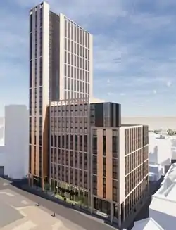 Code Sheffield is an under-construction skyscraper[lower-alpha 1] located at the junction of Wellington Street and Rockingham Street in Sheffield, South Yorkshire. Construction commenced in March 2022[1] as part of the Heart of the City 2 redevelopment of this area of the city centre. With an originally planned height of 117 metres (384 ft) once completed, Code Sheffield would have overtaken both the St Paul's Tower as the tallest building in Sheffield and Altus House in Leeds as the tallest building in Yorkshire.[1] However, due to rising costs the planned height of the building was reduced from 38 to 26 storeys.[2]