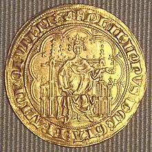 The "Chaise d'or" ("Golden throne") was a gold coin with the depiction of a large Gothic throne on which the king was seated. It was produced from August 22, 1303, and had a title of 1.000.[2] This coin was an authentic double Florin, with a weight of 7.10g at 24 karats. It was meant to erase the memory of the debased billon coins which had been in circulation. This coin incorporates the first elements of Gothic architecture ever on a French coin.
