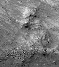 The Columbia Hills are a range of low hills inside Gusev crater on Mars. They were observed by the Mars Exploration Rover Spirit when it landed within the crater in 2004. They were promptly given an unofficial name by NASA since they were the most striking nearby feature on the surface. The hills lie approximately 3 kilometres (1.9 mi) away from the rover's original landing position. The range is named to memorialize the Space Shuttle Columbia disaster. On February 2, 2004, the individual peaks of the Columbia Hills were named after the seven astronauts who died in the disaster. Spirit spent a few years exploring the Columbia Hills until it ceased to function in 2010. It was also considered a potential landing site for the Mars 2020 Perseverance rover,[1] before the selection of Jezero crater in November 2018.[2]