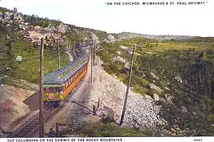 The Columbian was a named passenger train operated by the Chicago, Milwaukee, St. Paul and Pacific Railroad ("the Milwaukee Road") between Chicago, Illinois, and Seattle/Tacoma, Washington. The westbound train was Milwaukee Road train #17, and the eastbound train was train #18. It was launched on Monday, May 29, 1911.[1] The same day, the faster, limited-stop and more luxurious Olympian also launched.[1] These were the first passenger trains to take advantage of the Milwaukee Road Pacific Extension, which had opened to freight in 1909.[2]