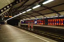 The decision to build Sentrum Station, located 700 meters (2,300 ft) west of Jernbanetorget,[27] was taken by the city council on 22 May 1969. The decision also involved the transfer station being placed at Slottsparken/Nationaltheatret. Construction of Sentrum started in 1972, and was immediately followed by the first water leaks being discovered. By the time the station opened on 9 January 1977, there were still no adequate countermeasures for the leaks.[34] During trials in January, it was discovered that the tracks were too low to allow all types of trains to open their doors, resulting in the tracks having to be raised.[35] In 1978, the city planner discarded the proposal by Oslo Sporveier to build a new station at Slottsparken, and instead decided that Sentrum would become the interchange between the two systems. This would allow the western network to be upgraded to metro standard at a later date, and subsequently also allow metro trains to run through the center. The proposal was supported by all political parties except the Labour Party.[36]