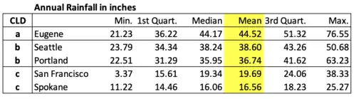 As shown, Seattle and Portland have mean rainfall levels that are not statistically different from each other. They are both classified "b". Also, San Francisco and Spokane have mean rainfall levels that are not statistically different from each other. They are both classified "c." But, Eugene's mean rainfall level is statistically different and higher than either Seattle & Portland or San Francisco & Spokane. And, Seattle & Portland have mean rainfall levels that are statistically different and higher than San Francisco & Spokane.