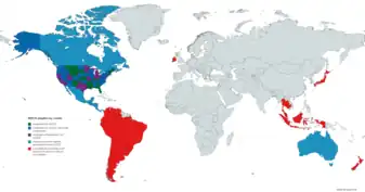 Chile | China | Colombia | Indonesia | Ireland | Jamaica | Japan | Liberia | Malaysia | Mexico | New Zealand | Panama | Peru | Philippines | South Korea | Taiwan | Thailand | United States | Uruguay | Vietnam | |