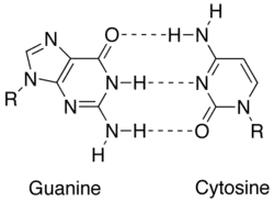 A complementary strand of DNA or RNA may be constructed based on nucleobase complementarity.[2] Each base pair, A = T vs. G ≡ C, takes up roughly the same space, thereby enabling a twisted DNA double helix formation without any spatial distortions. Hydrogen bonding between the nucleobases also stabilizes the DNA double helix.[3]