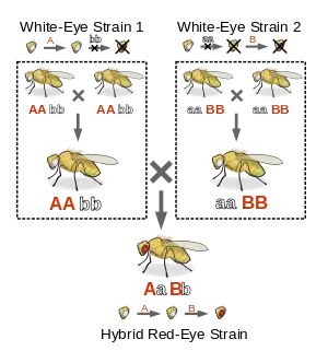 For a simple example of a complementation test, suppose a geneticist is interested in studying two strains of white-eyed flies of the species Drosophila melanogaster, more commonly known as the common fruit fly. In this species, wild-type flies have red eyes, and eye color is known to be related to two genes, A and B. Each of these genes has two alleles, a dominant one that codes for a working protein (A and B respectively) and a recessive one that codes for a malfunctioning protein (a and b respectively). Since both proteins are necessary for the synthesis of red pigmentation in the eyes, if a given fly is homozygous for either a or b, it will have white eyes.