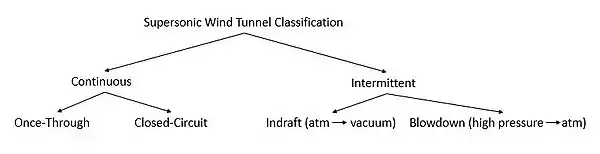 Wind tunnels can be divided into two categories: continuous-operating and intermittent-operating wind tunnels. Continuous operating supersonic wind tunnels require an independent electrical power source that drastically increases with the size of the test section. Intermittent supersonic wind tunnels are less expensive in that they store electrical energy over an extended period of time, then discharge the energy over a series of brief tests. The difference between these two is analogous to the comparison between a battery and a capacitor.