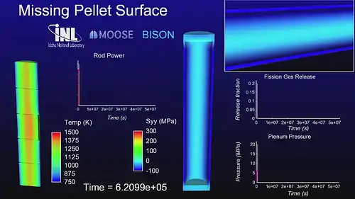 MOOSE / BISON simulation: A piece of a fuel pellet has chipped away (center left) due to a manufacturing defect or damage incurred while it was in transit. The damaged pellet surface induces a high-stress state in the adjacent cladding. As a result, the pellets warm up and densify before swelling back out due to fission products building up inside of them, further stressing the surrounding fuel cladding.