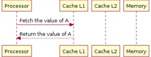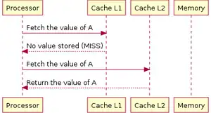 When the data is not where the processor is looking for, it is called a cache-miss. Below, pictures show how the processor fetch data when there are two cache levels.