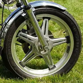 The Comstar wheel, sometimes referred to as Com-stars or stylised as ComStar,[1][2] was a composite motorcycle wheel that Honda fitted to many of its motorcycles from 1977[3][4] to the mid 1980s. Its design allowed it the option of being fitted with tubeless tyres and its use on the Honda CX500 was the first time tubeless tyres had been designed for a production motorcycle.[5][6]