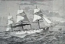 Planning for six metal-hulled corvettes began in 1876.[4] These vessels, which became the Comus-class corvettes, were designed by Nathaniel Barnaby. Among the Royal Navy’s last sailing corvettes,[5] they supplemented an extensive sail rig with powerful engines. Unlike their French rivals, which built fast steamers and needed neither long range nor a full rig of sail, the Royal Navy required their cruisers to be capable of long voyages away from coaling stations. Their ships therefore had a beamy hull to handle their sails, making them slower under steam than their French counterparts.[4]