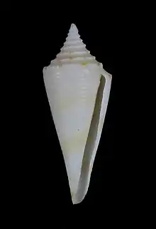| Apertural view of shell of Conasprella saecularis (Melvill, 1898), measuring 21.8 mm in height, trawled at 80 fms. off Aliguay Island, in the Philippines | |