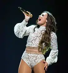 As one of the headliners of Dick Clark's New Year's Rockin' Eve, she performed a medley of "Cool for the Summer" and "Confident" again in Times Square on December 31, 2015.[53] On March 3, 2016, Lovato performed the song on American Idol with the top 8 contestants of the series' final season.[54] Another rendition of the song was given on the second edition of the Victoria's Secret Swim Special, which aired on March 9, 2016.[55] Lovato opened the 2016 edition of Wango Tango with a performance of "Confident" on May 14, 2016.[56] She later performed the song on The Late Late Show with James Corden, during the Carpool Karaoke segment, which appeared online on May 16, 2016.[57] On July 25, 2016, Lovato performed the song at the 2016 Democratic National Convention in support of Hillary Clinton.[58] On September 6, 2016, the singer performed "Confident" and "Body Say" at the Made for History fashion fundraiser hosted by Anna Wintour for Clinton.[59] "Confident" was included in Lovato's setlist for the Future Now Tour.[60] Lovato performed the track during her sixth headlining concert tour Tell Me You Love Me World Tour.[61]