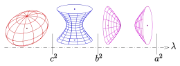 A triaxial ellipsoid with semi-axes where determines a pencil of confocal quadrics. Each quadric, generated by a parameter is the locus of points satisfying the equation: