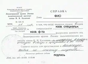 Traditionally, all full-time Soviet students benefited from a draft postponement until graduation. If the college/university had a military chair (which provided training in a particular military specialty), its students became reserve officers and were exempt from service as private soldiers. Without a military chair the graduates were conscripted for a shortened term. For many people, an intention to avoid or at least to defer soldier service was a main reason for studying.[11] However, between late autumn 1982 and 1988 the Soviet Union had a mandatory draft for students of most universities,[12][13] with the peak conscription fraction in 1987. Students were drafted for two or, if for the navy, three years, of military service, typically after termination of the first or second academic year.