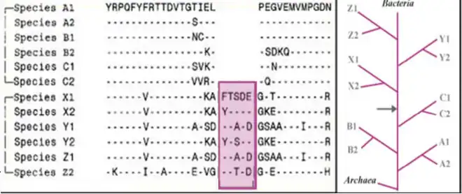 Figure 2 shows an example of 5aa CSI found in a conserved region that is commonly present in the species belonging to phyla X, Y and Z, but it is absent in other phyla (A, B and C). This signature indicates a specific relationship of taxa X, Y and Z and also A, B and C. Based upon the presence or absence of such an indel, in out-group species (viz. Archaea), it can be inferred whether the indel is an insert or a deletion, and which of these two groups A, B, C or X, Y, Z is ancestral.[7]