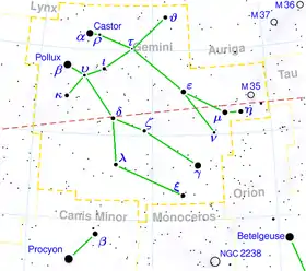 κ Gem is a binary star 143 light-years from Earth. The primary is a yellow giant of magnitude 3.6; the secondary is of magnitude 8. The two are only divisible in larger amateur instruments because of the discrepancy in brightness.