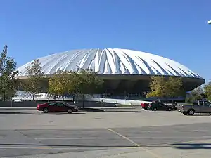 The construction of State Farm Center, originally known as the Assembly Hall, at the University of Illinois at Urbana–Champaign consisted of building a huge indoor arena with a 400-foot-diameter (120 m) concrete dome whose center height is 125 feet (38 m) above the center floor, and which weighs 10 million pounds.[1] The building is considered an engineering marvel because of the unique method used to build the concrete roof.[2] State Farm Center, the first-ever concrete dome arena, hosts the campus's teams in men's and women's basketball, numerous concerts and other events. It holds sentimental value for numerous alumni and fans alike and attracts attention for its design and construction.[3] The construction of the Assembly Hall was conceived to provide UIUC with needed space for ceremonies and athletic events. The university’s population had outgrown the largest building on campus at that time, the Auditorium (later rededicated Foellinger Auditorium), and desired one building that could hold the entire university class.[4] The design of the new building, by Max Abramovitz, called for the construction of one of the world’s largest edge-supported structure.[5] The assembly hall was completed in 1963, and was dedicated on Honors Day, Friday May 3.[5]