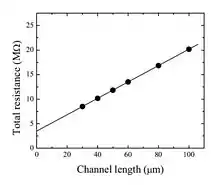 where and are contact and channel resistances, respectively, is the channel length/width, is gate insulator capacitance (per unit of area), is carrier mobility, and and are gate-source and drain-source voltages. Therefore, the linear extrapolation of total resistance to the zero channel length provides the contact resistance. The slope of the linear function is related to the channel transconductance and can be used for estimation of the ”contact resistance-free” carrier mobility. The approximations used here (linear potential drop across the channel region, constant contact resistance, …) lead sometimes to the channel dependent contact resistance.[2]