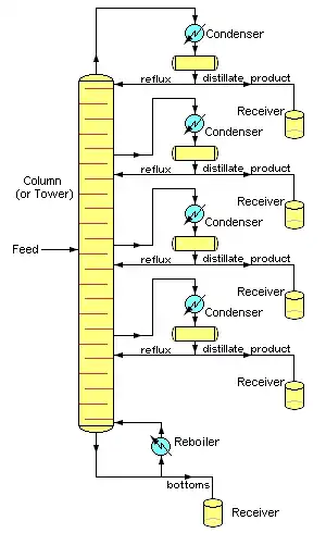 Images 4 and 5 assume an overhead stream that is totally condensed into a liquid product using water or air-cooling. However, in many cases, the tower overhead is not easily condensed totally and the reflux drum must include a vent gas outlet stream. In yet other cases, the overhead stream may also contain water vapor because either the feed stream contains some water or some steam is injected into the distillation tower (which is the case in the crude oil distillation towers in oil refineries). In those cases, if the distillate product is insoluble in water, the reflux drum may contain a condensed liquid distillate phase, a condensed water phase and a non-condensible gas phase, which makes it necessary that the reflux drum also have a water outlet stream.