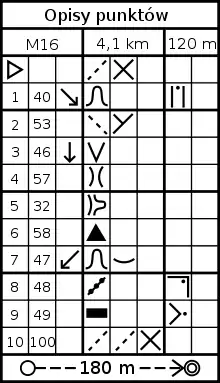 In orienteering competitions the locations of the control points are described on a control description sheet (or clue sheet). It is sometimes incorrectly referred to as a "Course Description Sheet". For beginners, and the younger competitors, the description is written in a simple text format, but for advanced orienteers the descriptions use symbols (pictorial), in accordance with the IOF Control descriptions.[6] These symbols eliminate any language-based confusion, vital for international competition. The control descriptions are fixed to or printed on the map, and separate control description sheets may be available at the prestart.[7] Some competitors wear the extra control description sheet in a holder strapped onto their forearm, so that they can read it while running.
