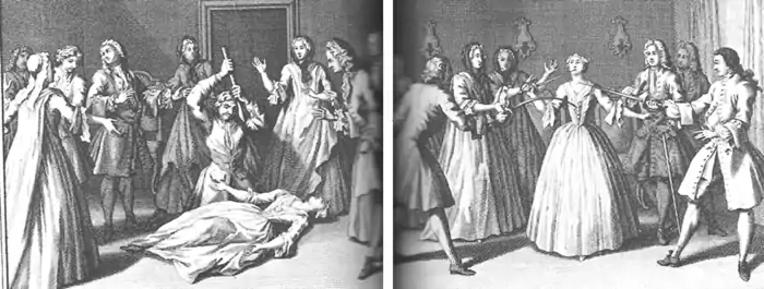 Public opinion, however, would turn against the convulsionnaire movement by the mid-1730s as more scandalous stories of torture and violence came to light. "In the popular mind," Strayer writes, "their tortures had crossed the line between the self-denial of spiritual mystics and sexual brutality. Increasingly, people viewed this strange blend of millenarianism, eroticism, torture, and hysteria as a medical problem rather than a religious phenomenon."[49] In 1735, a group of 30 Paris physicians proposed that "overheated imaginations" were the cause for the convulsions.[50]