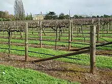To the west of the ridge lies black rendzina soil which is poorly drained, and so is much less favourable for vines. There is also a 'transitional', or brown rendzina, soil which grows vines quite successfully.[11] This geological complexity led to many disputes during an eight-year period before Coonawarra was entered on the Register of Protected Names. At least one vineyard (belonging to Penola High School) has the boundary pass through the middle.