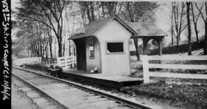 The station first appears on an 1885 timetable where it opened as a flag stop for all trains.[2] From the time of the station's opening until 1888 when the postmaster was caught embezzling stamp sales, a post office was housed in the station.[3] Writer and author Mark Twain, who at that time lived in the neighboring town of Redding, frequently took the train from Branchville to the station in order to meet with his friend Colonel Edward M. Knox,[3] who also played a pivotal role in the creation of the station.[1] Passenger service to the station continued until passenger operations were discontinued on the Ridgefield Branch on August 8, 1925.[4] Although freight service would continue until 1964 on the Ridgefield Branch, the station was abandoned the same year passenger service ended.[2]