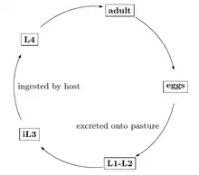 The life cycle of C. oncophora is direct. Free-living L3 stage larvae residing on the pasture are taken up by grazing cattle and pass to the small intestine. Here, they molt to L4 larvae and then to adults. Eggs are passed in the faeces to the pasture. The larvae hatch and grow to L3 stage larvae. Infective L3 stage larvae are then again taken up by grazing cattle and the life cycle repeats. The pre-patent period, which includes the time between infection and egg laying, lasts between two and three weeks. Like other trichostrongylids, early C. oncophora L4 larvae are able to arrest their development under unfavourable environmental conditions such as low temperatures and high dryness, a process termed hypobiosis.[7] L4 larvae can stay arrested up to five months. Arrested development is characterized by a large number of individuals stopping at the same stage of development, a bimodal distribution of worm sizes, and a recent exposure of the host animal to the infectious agent prior to the prepatent period of the infectious agent. During this period of arrested development, the worms stop growing and slow down their metabolism. Arrested development allows the worms to evade many of the anthilmentics commonly used. The recommended doses are based on adult worms and normally developing larvae. Arrested development can be triggered by the following situations: seasonal influences on the larvae while outside the host, the normal host immune response interrupting the normal parasitic phase of the life cycle, or overpopulation of adults that leads to negative feedback preventing the further development of more larvae. It is advantageous for nematodes to enter arrested development as they can survive in hostile environments, cause disease in the host by a large portion of the larvae resuming development, produce large numbers of infectious eggs when the environmental conditions are once again favorable, and avoid susceptibility to various anthilmentics.[8]