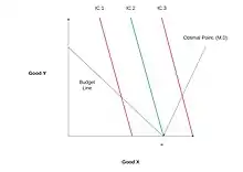 This diagram shows an example corner solution where the optimal bundle lies on the x-intercept at point (M,0). IC 1 is not a solution as it does not fully utilise the entire budget, IC 3 is unachievable as it exceeds the total amount of the budget. The optimal solution in this example is M units of good X and 0 units of good Y. This is a corner solution as the highest possible IC (IC 2) intersects the budget line at one of the intercepts (x-intercept).[1]