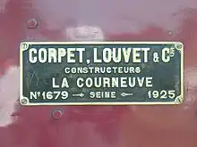 Works numbers 1416 to 1962 carried Corpet, Louvet & Compagnie worksplates. Production was severely hit by the First World War, with only three locomotives being outshopped in 1915 and none in 1916. During the 1920s, production was mainly metre gauge six-coupled tank engines. During the early 1930s, production was mainly 1,435 mm (4 ft 8+1⁄2 in) standard gauge 0-8-0-ST and 2-10-2ST locomotives. The Depression hit the firm hard, with only two locomotives being delivered in 1934, 1935, 1936 and 1938. No new locomotives were delivered in 1937 or 1939. During the Second World War, Locomotives under construction when Paris was overrun were completed, but some of these could not be delivered to their intended customers, and saw service in France. The largest locomotives built by Corpet-Louvet were ten 2-10-2T locomotives built for SNCF in 1940-42. These weighed 91 tonnes. Six standard gauge 0-8-0ST locomotives were built for Krupp in 1944. It is thought these locomotives carried Krupp works plates. The first locomotive delivered after the liberation of Paris in August 1944 was works number 1875, a standard gauge 0-8-0T of similar design to those built for Krupp. The last locomotive built for a French light railway was works number 1926 built for the Chemin de Fer de Cambrésis in 1948. The last locomotive, works number 1962 was ordered by the Houillères du Bassin d'Auvergne but subsequently cancelled. However, a locomotive carrying works number 1962 was recorded in service with the company in 1955![4]