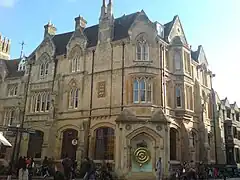 The Corpus Clock, also known as the Grasshopper clock, is a large sculptural clock at street level on the outside of the Taylor Library at Corpus Christi College, University of Cambridge, in the United Kingdom, at the junction of Bene't Street and Trumpington Street, looking out over King's Parade. It was conceived and funded by John C. Taylor, an old member of the college.