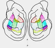 Auditory cortex of a cat brain. The colored sections are those implanted with cryoloops (10 total), which encompass the 13 acoustically responsive sections of the cat auditory cortex. A – anterior, P – posterior.