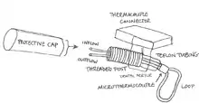 Cryotips are made of two stainless steel hypodermic-needle tubes, such as 18 gauge tube surrounding a 24 gauge tube, soldered together. Like the cryoloop, cooled methanol flows through the inner tube to cool the device. If the investigator chooses to insulate the shaft of the tube, a low-resistance heater-wire can be wrapped around the outer tube except for 2 mm at the tip; passing a direct current through the wire keeps the shaft at normal brain temperature. This ensures localized cooling at the tip, which is inserted into the brain to reach deeper structures, without cooling the overlying structures. More than one microthermocouple is required to measure shaft and tip temperatures.[4] Modified versions of this device use smaller gauge tubing (21 and 30 gauge), and additional tubing is attached to form a y-shaped fork with HFC-134a cooling agent flowing through the double tubing while the fork is under vacuum. The vacuum causes the coolant to flow from the inner tubing into the outer tubing (so the coolant is in between the inner and outer tubes as well as inside the inner tube).[5] Cryotips are usually used to cool deeper structures of the brain that cannot be thermodynamically cooled from the surface. They are not used much in cortical cooling due to the small volumes that are cooled – investigators cooling cortical tissue are usually interested in larger sections than this device can cool. Cryotips cool tissue volumes of 2 mm3 to 5 mm3.[1] Usually the shaft of the device is insulated or even heated for localized cooling, however, some studies have used uninsulated cryotips to cool surface structures in addition to the deeper sections.[6]