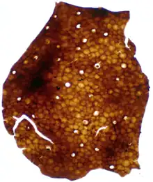 | Cuticle of Cosmochlaina, retrieved from the Burgsvik beds by acid maceration. Cells about 12 μm in diameter. | |