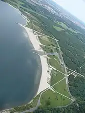 During the revegetation, a local recreation area with a beach and landscape park was laid out around the lake and opened as part of Expo 2000 on 1 June 2000. The leisure activities are for sunbathing and swimming and are well accepted by sailors, windsurfers, kite surfers, inline skaters, divers and cyclists, so that the Cospudener See has developed into a popular local recreation area. In recent years, it has been frequented by an average of around 450,000 people per season.[11] In the course of the Leipzig Olympic application for 2012,[12] competitions were held at Lake Cospuden. Rowing, triathlon and beach volleyball and a wide range of other leisure activities are planned. The lake offers the following uses: