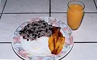 Gallo pinto, which has a literal meaning of "spotted rooster", is the national dish of Costa Rica. It consists of rice and beans stir-fried together in a pan to create a speckled appearance.[2] It is usually served for breakfast along with scrambled or fried eggs and sour cream or cheese[1] Seasonings in the mixture of rice and red or black beans include cilantro, red pepper, onion, celery, and Salsa Lizano.[4] Gallo pinto is also the national dish of neighboring country Nicaragua. There is controversy throughout both countries and their regions as to the perfect composition of beans, rice, and spices in this dish. Pinto, the term the locals use to refer to this dish, is available all over the country at very affordable prices.