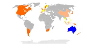 Countries with at least one active club and/or national team including Australian players: