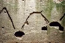 The bricks were probably made at the St Benet's Abbey in Norfolk, with the stone coming from chalk pits near Norwich's southern Conesford Gates.[25] The brickwork, particularly on the stairwell, is particularly well executed, and archaeologist T. P. Smith considers the tower to feature some "of the finest medieval brickwork" in England.[1] It is the earliest known use of brick in an external load-capacity in Norwich.[35] The use of brick in this sort of fortification was both prestigious and practical, as brick absorbed the impact of artillery fire better than stone.[36] The river bends around about 1 metre (3 ft 3 in) from the bottom of the tower, and its base may have been underpinned with timber piles during its original construction.[37]