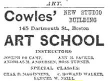 Cowles Art School (Cowles School of Art) was established in 1883, in a studio building located at 145 Dartmouth Street in Boston, Massachusetts. It was one of the largest art schools in the city and boasted an enrollment of several hundred until it was closed in 1900.[1]