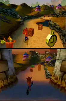 Production of Warped began in January 1998, with Naughty Dog given only ten and a half months and a budget of over $2 million to complete the game.[15][16][17] It was released in North America on November 3, 1998, and in Europe on December 11, 1998.[18] Programmers Andy Gavin, Stephen White and Greg Omi created three new gameplay engines for the game. Two of the three new engines were three-dimensional in nature and were created for the airplane and jet-ski levels; the third new engine was created for the motorcycle levels in the style of a driving simulator. The new engines combined make up a third of the game, while the other two-thirds of the game consist of the same engine used in the previous games. Jason Rubin explained that the "classic" engine and game style was preserved due to the success of the previous two games and went on to say that "were we to abandon that style of gameplay, that would mean that we would be abandoning a significant proportion of gamers out there." An arbitrary plane z-buffer was created for the jet-ski and flooded Egyptian levels of the game.[16] To create a completely fluid feel for the water on these levels, an environment map that reflects the sky was fitted onto the surface of the water.[19] A real shadow was given to the Crash character at the request of the Sony Computer Entertainment America producers, who were "sick of that little discus that's following him around."[20] To create an "arcade" experience in the airplane levels and to differentiate them from flight simulators, the enemy planes were programmed to come out in front of the player and give the player ample time to shoot them before they turn around and shoot the player rather than come up behind the player and hit them from behind.[21] The Relic system was introduced to give players a reason to return to the game after it has been completed.[22]